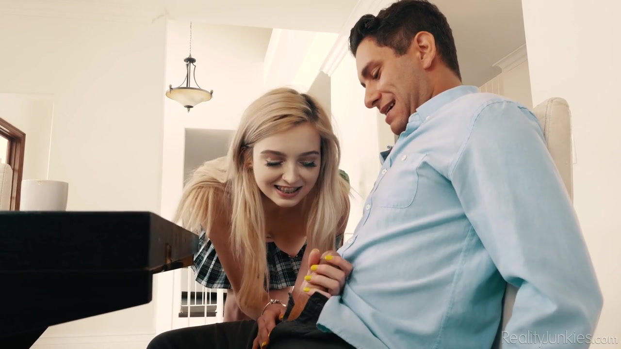 «Молодая блондиночка поругавшись в университете с бойфрендом решила найти утешение в компании зрелого мужчины. Опытный любовник сразу оценил превосходные длинные ножки белокурой девицы, и как только малышка эротично сбросила с себя маячку, его член незамедлительно на нее встал. Не сдерживая желаний самец вытащил из штанов хуй и насладился первоклассным исполнением орального секса, в котором белокурая куколка с радостью показала на что она способна. После прелюдии возбудившийся хахаль испытал все прелести узенького влагалища, присовывая в девку во всех позах которые ему нравятся.»