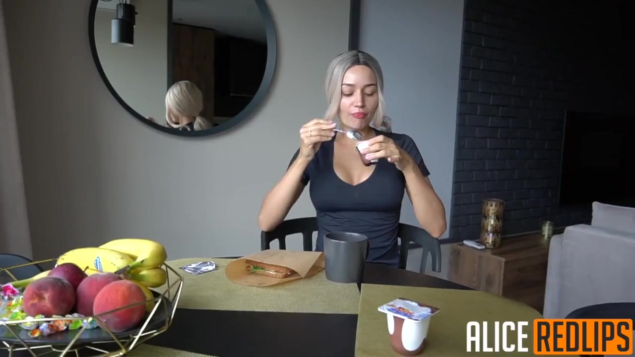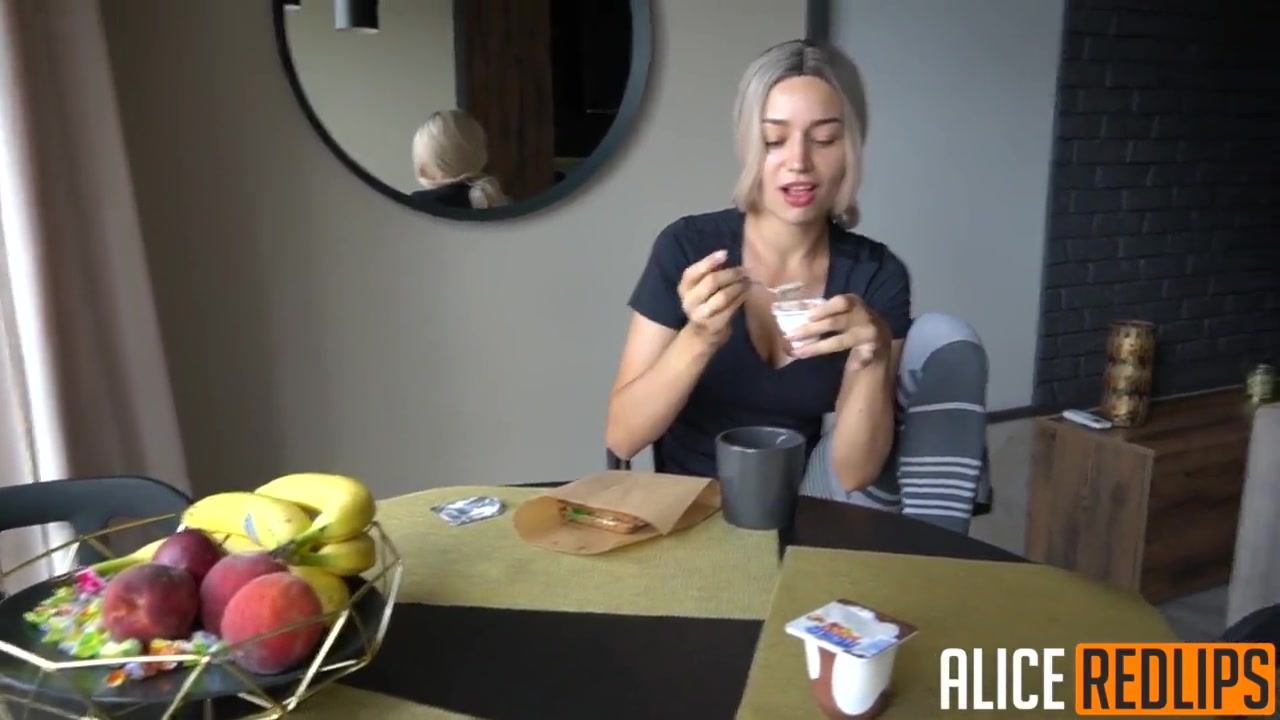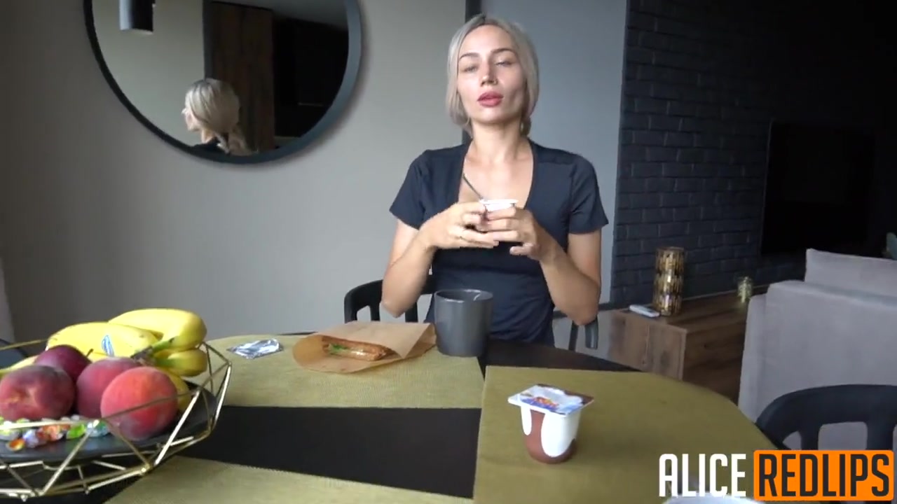 «Симпатичная блондиночка позавтракав с парнем решила начать их день с очень страстного секса, в котором на планирует испытать оргазм по которому так сильно изголодалась. Ловелас охотно поддержал данную затею и как только выставил фаллос, малышка сразу ринулась его поднимать губками, воплощая в реальность все желания партнера в невероятной оральной прелюдии. Затем стройная цыпочка запрыгнув на стул отодвинула в сторонку трусики и с явным удовольствием на лице отдалась на против зеркала, с наслаждением наблюдая как активный пихарь из за всех ее долбит ее мокрую щелку сзади.»