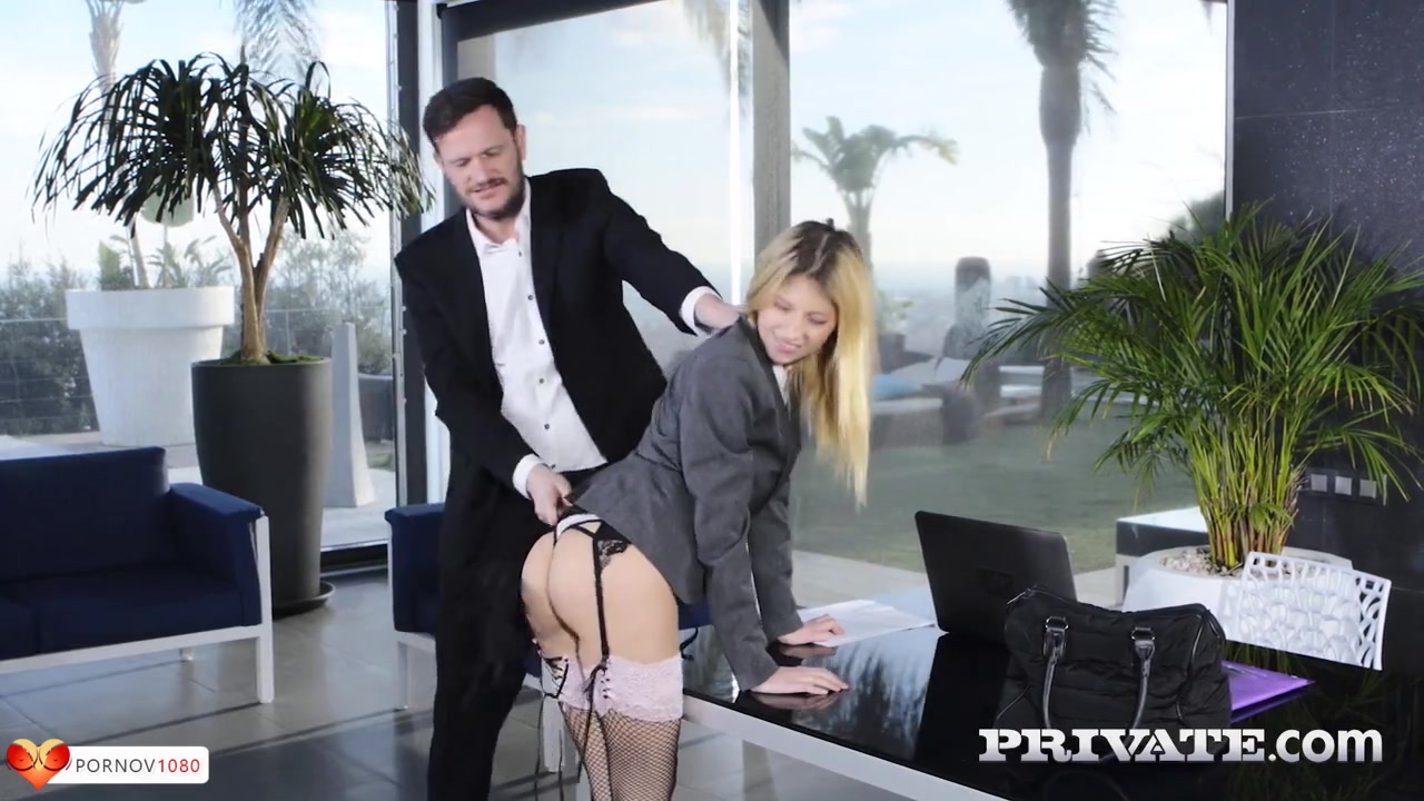«Обворожительная светловолосая девушка работая секретаршей принесла отчет боссу, который давно испытывает желание ее трахнуть. Поняв что девчонка не справилась с поставленной задачей, мужчина решил ее отшлепать. Белокурая куколка не стала перечить боссу и как только он ее наклонил раком, малышка ощутила хлыст на своей упругой заднице. После прелюдии самец поставил красавицу на корточки и как можно глубже засадил елдак ей в рот. Девчонка отлично исполнила счастливчику головокружительный минет, после чего дала себя трахнуть в узенькую задницу.»