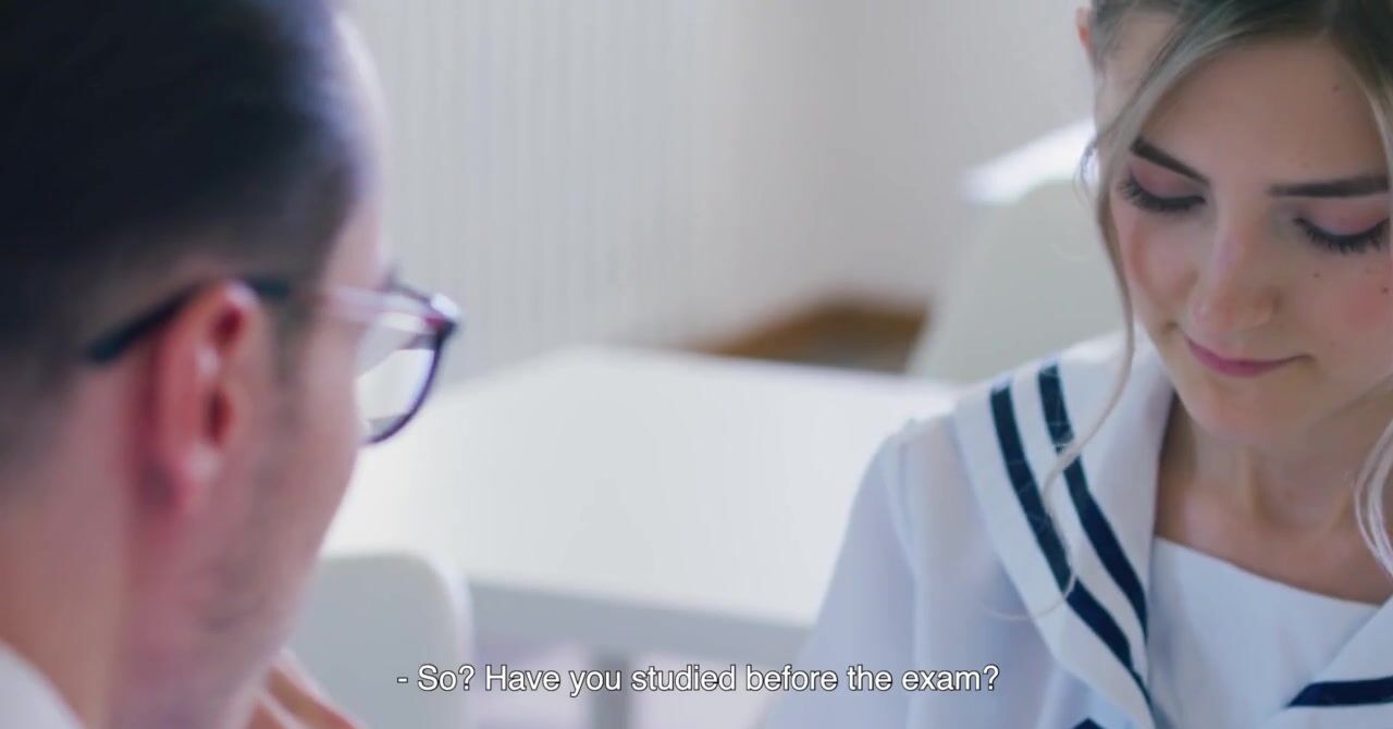 «Молодой препод влюбился в милую студентку, которую он оставил после занятий, чтобы признаться в своих чувствах. Оказалось, что красивая девчонка испытывает то же самое, а ещё она предлагает немедленно заняться сексом. Худышка с большими натуральными сиськами уже не выдерживала, ей безумно хотелось насладиться членом учителя. Фигуристая цыпочка взала его в ротик и сделала минет, а затем отдалась в писю.»