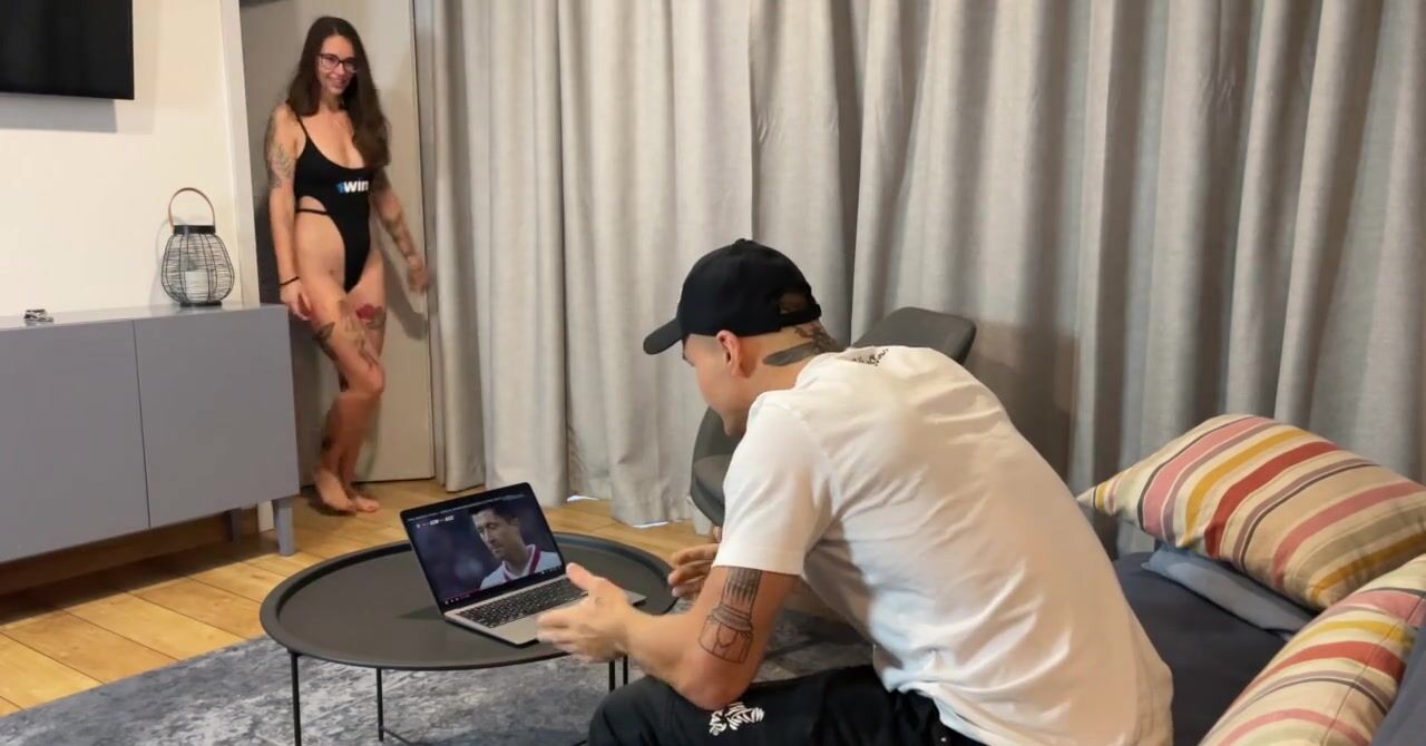 «Любимая футбольная команда парня побеждает. Радостная девушка в сексуально боди предлагает отпраздновать это событие жаркой еблей. Черноволосая бестия спешит взять его член в ротик, чтобы страстно отполировать его, после чего можно уже и в пизду ей хуй засаживать. Бойфренд насладился мокрой киской проказницы, а сперму спустил на её лицо, испачкав лицо и очки девицы, но развратнице это даже понравилось.»