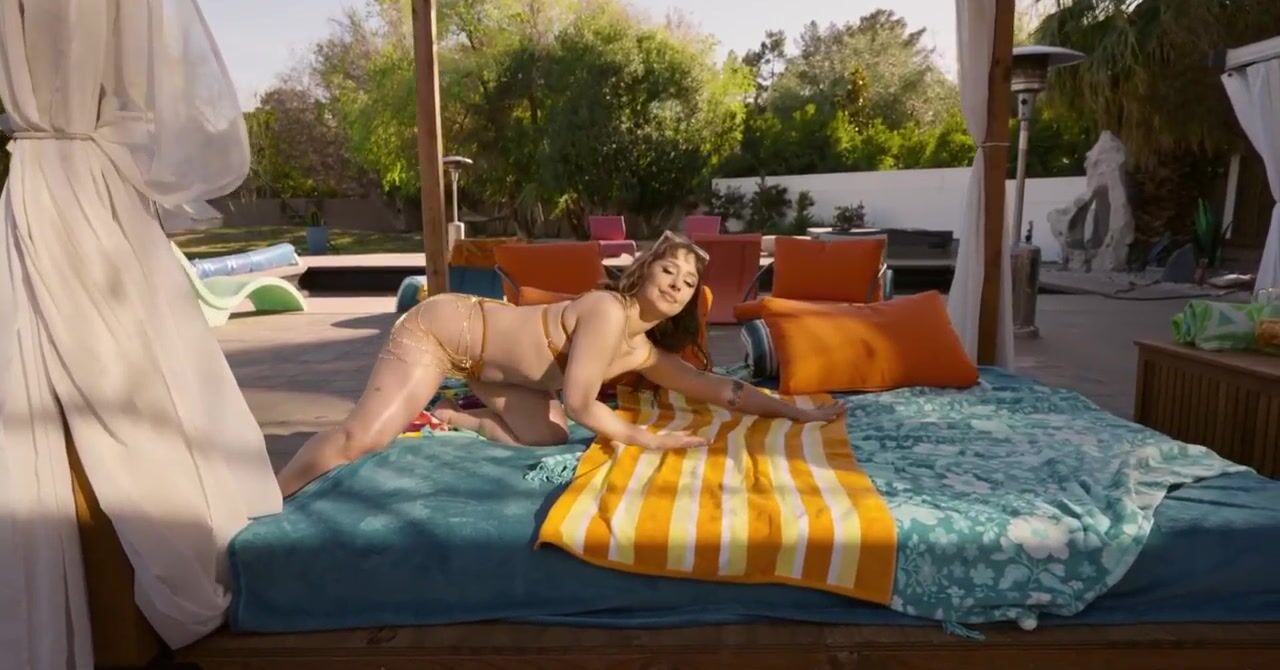 «С такой жаркой милфой невозможно соскучиться, она засовывает себе в очко у бассейна анальную пробку, а так же увлажняет соблазнительное тело большим количеством масла. Эта опытная бестия с большой жопой и сиськами, одетая в желтый купальник, уже вскоре отдается негру и получает нереальный кайф от межрасовой ебли. Она насладилась как глубокий минетом, так и жарким аналом, чел отымел её в жопу очень страстно.»
