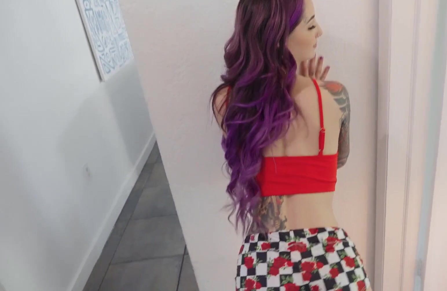 «Красивая неформалка с татуированным телом и фиолетовыми волосами предлагает негру с большим членом снять домашнее порно. Парень идею сразу не оценивает, а потом всё же берет камеру в руки и снимает от первого лица девицу, которая принимается делать ему смачный минет. Жаркая худышка с пирсингом на теле отдается в пизду после минета, отодвигая красные трусики в сторону. Она получает нереальный кайф и кончает.»