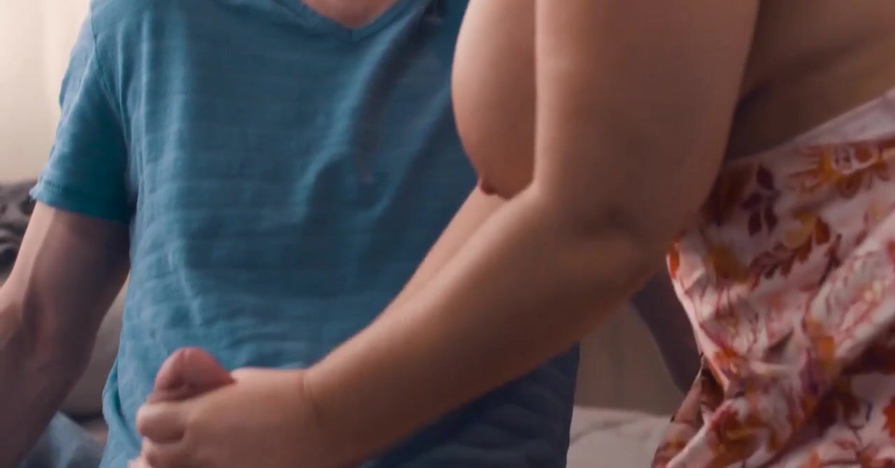 Рыжая мачеха ласкает хуй большими сиськами и дает пасынку