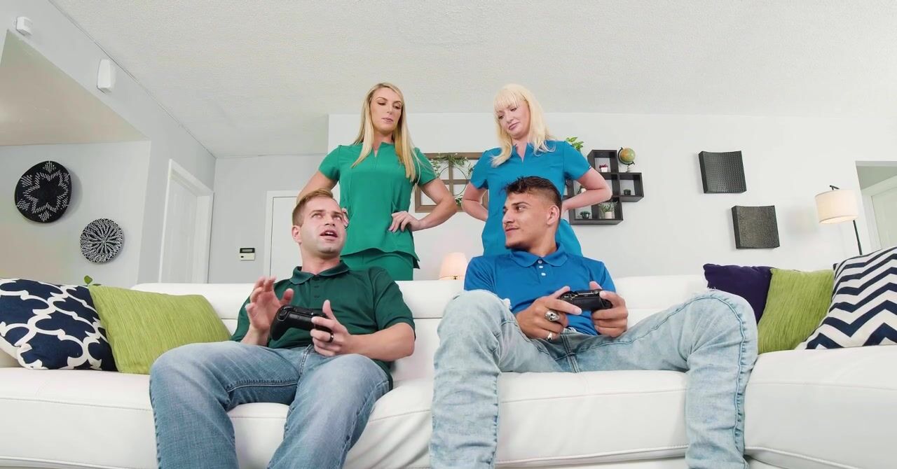 «Молодым парням стало плохо и они вызвали скорую помощь. Две зрелые медсестры провели обследование и решили, что это всё от нехватки секса. Как давно пацаны трахались? Наверное, несколько месяцев назад. Нужно срочно их спасать, белокурые медсестры сделали искусственное дыхание член в рот. Это подняло пацанам настроение, но ещё предстояло много работы. После отсоса медицинские работницы взялись уже за еблю.»