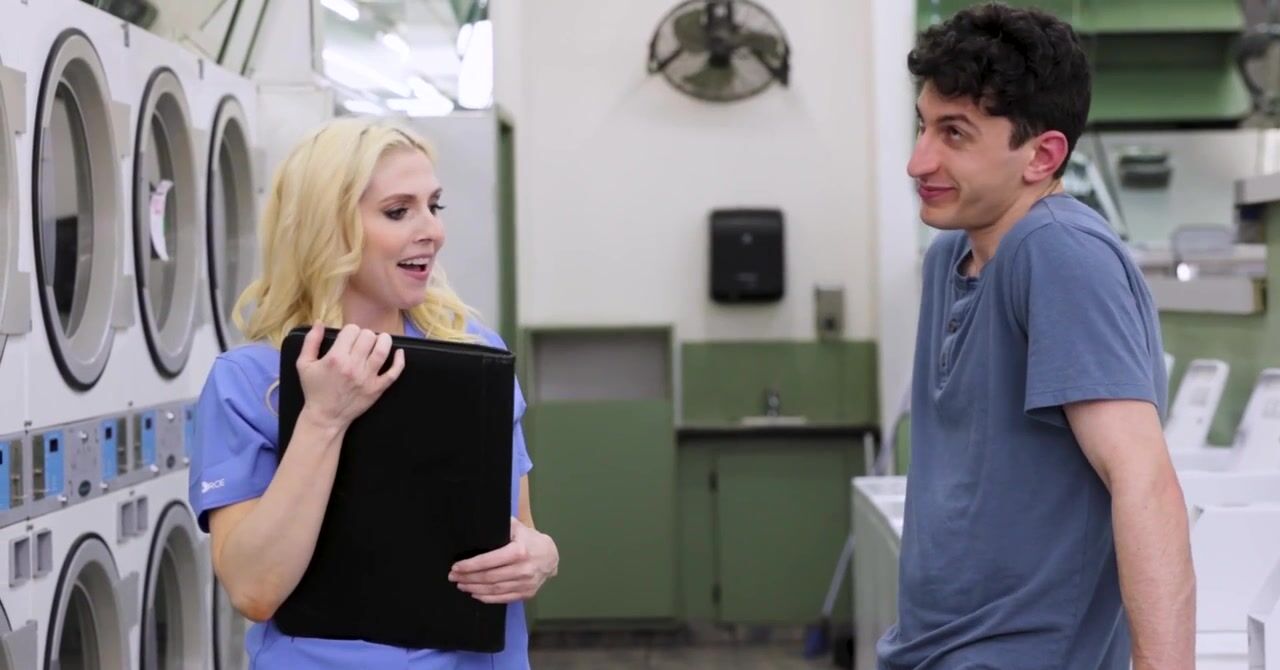 Девка наслаждается ЖМЖ в прачечной с парнем и милфой