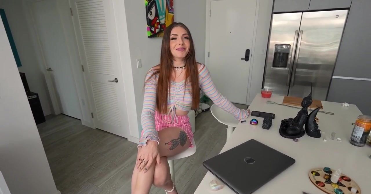 Татуированная падчерица в розовой юбке сосет хуй отчима