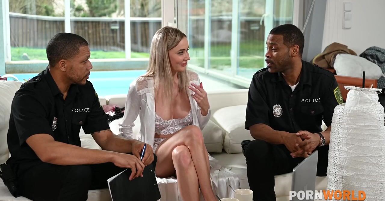 «Как заняться групповым сексом с двумя черными полисменами? Белокурая красотка поступает очень просто, она звонит в полицию, заявляя что её ограбили, а сама надевает сексуальное белье и ждет. Когда черные ребята приходят к ней домой, она начинает действовать и соблазняет на ЖМЖ. Блюстителей порядка без групповой ебли она никуда не отпустит. А отдается блондинка не только в киску, но и в попку тоже, наслаждаясь двойным проникновением.»