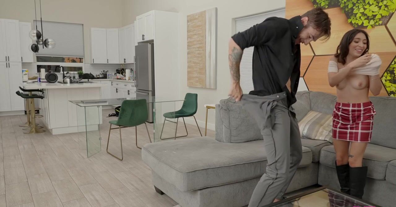 «Стройная девушка соблазняет парня на секс, когда его мать выходит из комнаты. Брюнетка ничего не может с собой сделать, ей безумно хочется трахаться и она намерена удовлетворить свои потребности. Худышка первым делом смачно отсасывает твердый член, а потом отдается в бритую киску, раздевшись полностью. Девка только сапоги остается, они довольно сексуально смотрятся на ней, учитывая что телка совсем голая.»