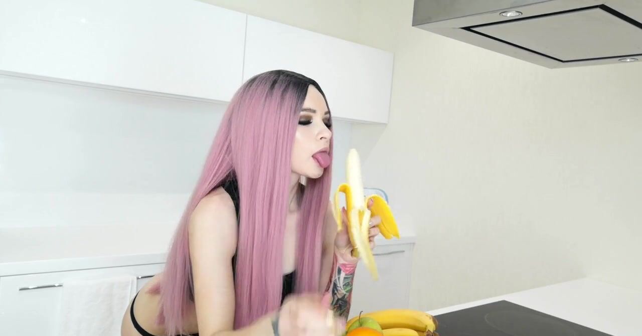 «А никакого обеда нет, вместо еды, стройная красотка сама ложится на стол и расставляет ножки в стороны, показывая свою бритую киску. Эта смазливая цыпочка с маленькими сиськами предпочитает ебаться вместо обеда, такая у неё диета. Чувак не возражает, он засаживает хуй в девку с розовыми волосами и жарко её трахает, спуская сперму в бритую писю. Довольная крошка собирает кончу пальцами и облизывает их.»