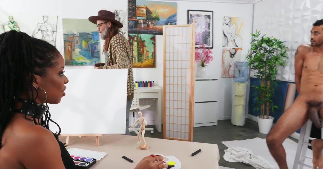 «В искусстве важны эмоции, а не техника исполнения, поэтому чернокожая красотка решает не писать картину, а вместо этого заняться сексом с голым натурщиком, создав при этом настоящее представление. Студентка художница быстро возбуждает негра с большим членом и принимается делать ему шикарный минет, после чего уже отдается в мокрую киску и получает удовольствие. Её однокурсницам этот перформанс очень понравился.»