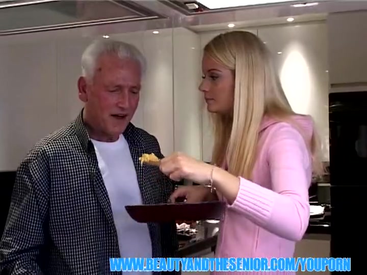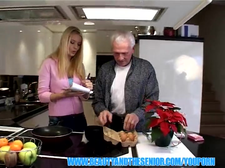 «Дедуля и в столь почтенном возрасте не утратил вкуса к жизненным удовольствиям. И за это он заслуживает уважения. Когда вы увидите, какую кралю ему удалось пригласить к себе в гости, то согласитесь – этот обаятельный старичок еще на многое сгодится. Кстати, блондиночка пришла не просто так, а с целью обучиться у мэтра искусству кулинарии. Для начала безрукой соске предстоит освоить рецепт яичницы-болтуньи, а чуть позже она сама покажет дедочку мастер-класс поцелуев. Уж смачный засос от молодой блондинки возбудил в пенсионере самые нескромные желания – он тут же стал раздевать милашку и лапать ее замечательную попочку. Конечно, потенция в этом возрасте, не то, что лет сорок назад, но сладкие губки девицы обязательно приведут ствол в полную боевую готовность. А уже если этот орган встал, то имеет смысл поставить красотку раком и насладиться объятиями ее жаркой и очень тесной киски.»