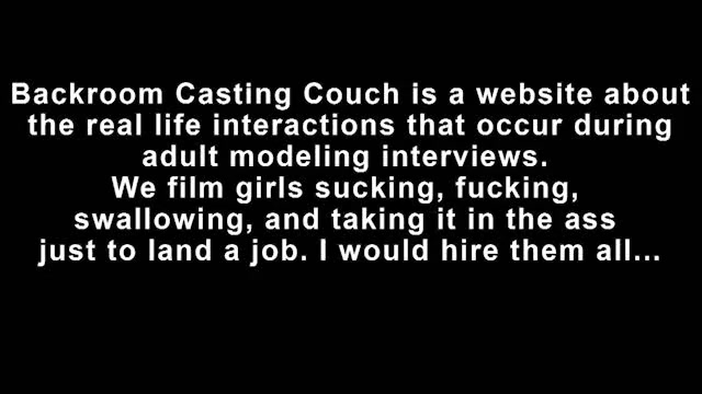 «Главное в деле соблазнения – это большой и удобный кожаный диван. Когда телки ощущают попкой удобное посадочное место, то они моментально расслабляются. Конечно, парню, который играет роль продюсера, а на самом деле просто желает затащить очередную «модель» в постель, нужно приложить еще некоторое количество усилий, дабы увлечь малышку. Сначала это просто болтовня, во время которой брюнеточка рассказывает о своей интимной жизни, а потом просьба переодеться в другой костюмчик. Кстати, этот наряд более целомудрен, чем тот, в котором пришла претендентка. А уж без одежды она и вовсе удивительно хороша, особенно, когда встает раком и выставляет свои булочки на всеобщее обозрение. Уж тут впору возбудиться и попросить девчонку помочь с эрекцией. Брюнетка, кстати, любит сосать и готова побаловать и себя и кавалера отборным, страстным сексом. Ее чувственная попочка очень сильно хочет этого.»